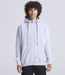 Heather grey 65% ringspun cotton/35% polyester. Soft cotton faced fabric.Brushed back fleece.Drop shoulder style.Three panel, single jersey lined hood with flat lace drawcord.Full length plastic zip with chin guard.Front pouch pockets with flatlock stitching.Ribbed cuffs and hem.Tear out label.